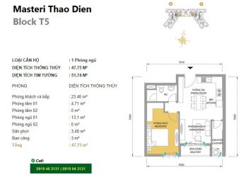 Apartment for rent at Masteri Thao Dien includes 1 bedroom, 1 bathroom, area of 52m2. The apartment is fully equipped with high-class furniture, modern design. Apartment for rent on high floor of T5 tower, nice view.