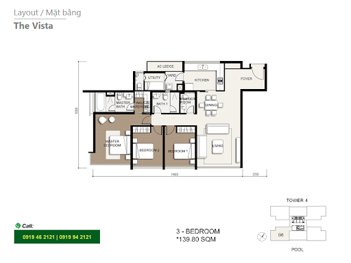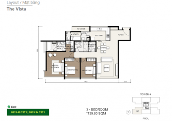 Selling The Vista An Phu apartment on the lower floor of T2 has an area of 139.8m2 with 3 bedrooms, 3 bathrooms, living room and kitchen. Has city view
