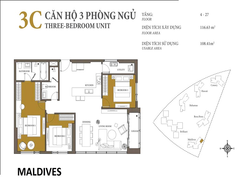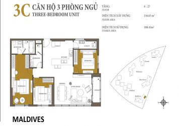 Diamond Island apartment for rent low floor Maldives tower, with 3 bedrooms, 2 bathrooms, area 116m2. Luxuriously designed with full high-class furniture surrounded by romantic river view.
