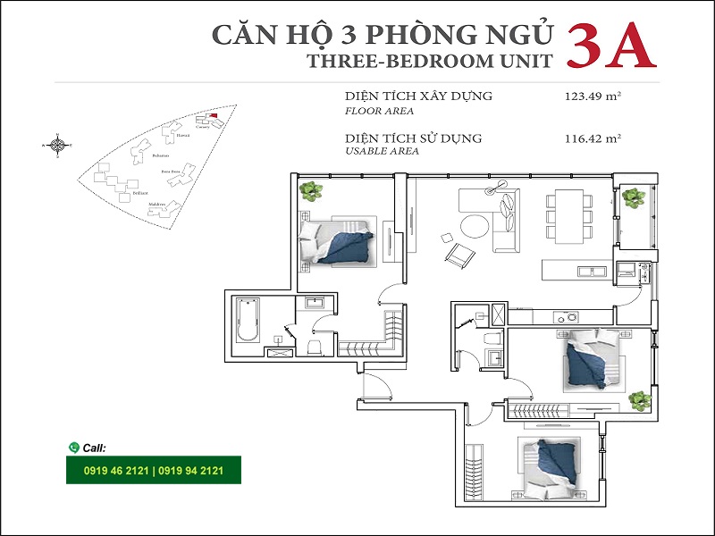 Apartment for rent at Diamond Island has an area of 123m2, possessing modern design, apartment architecture includes 3 bedrooms, 2 bathrooms, large living room, dining room, kitchen, …