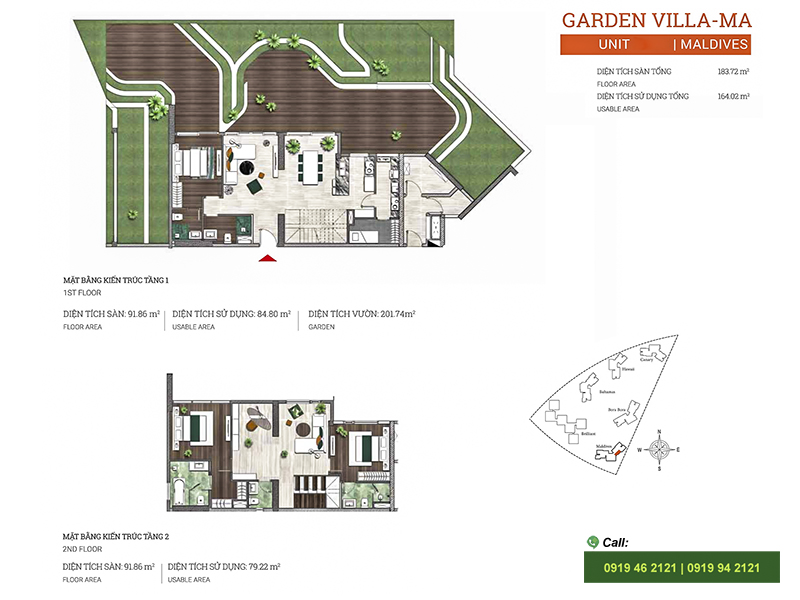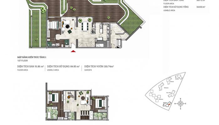 – 1st floor includes living room, 2 bedroom, 2 wc, dining room, kitchen, … with floor area of 91.86m2, garden area of 201.74m2.