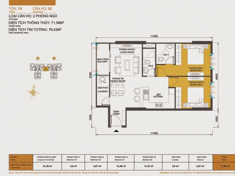 Masteri Thao Dien for rent apartment high floor T4 tower, area 76.65m2, including 2 bedrooms, 2 bathrooms, living room, dining room,…. balcony with river view brings coolness to the apartment .