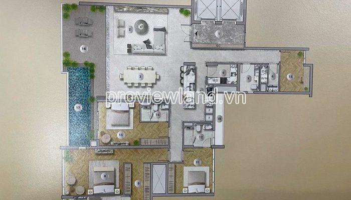 Pool Villa The River Thu Thiem apartment for sale, right at Thu Thiem 1 bridge, with an area of about 290m2, a clear area of 260m2, private swimming pool design, private elevator with beautiful river view and city center eye.